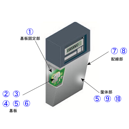 | 5 熱伝導シート | 6 超薄型表面導電性フィルム レミレス | 7 フェライト | 8 貫通部材 |